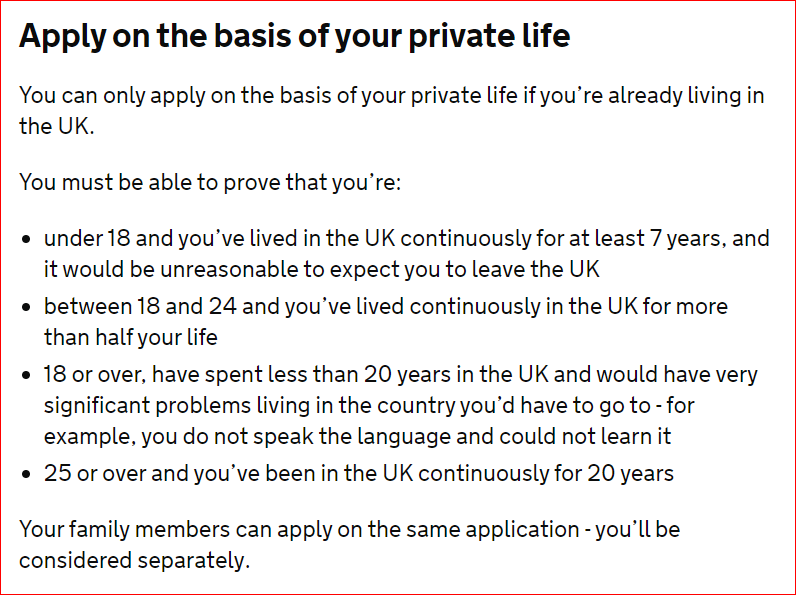 -年满25岁或以上:在英国已经连续居住至少20年;在这一点上,当事人基本就是以“非法居留20年”来申请身份的。